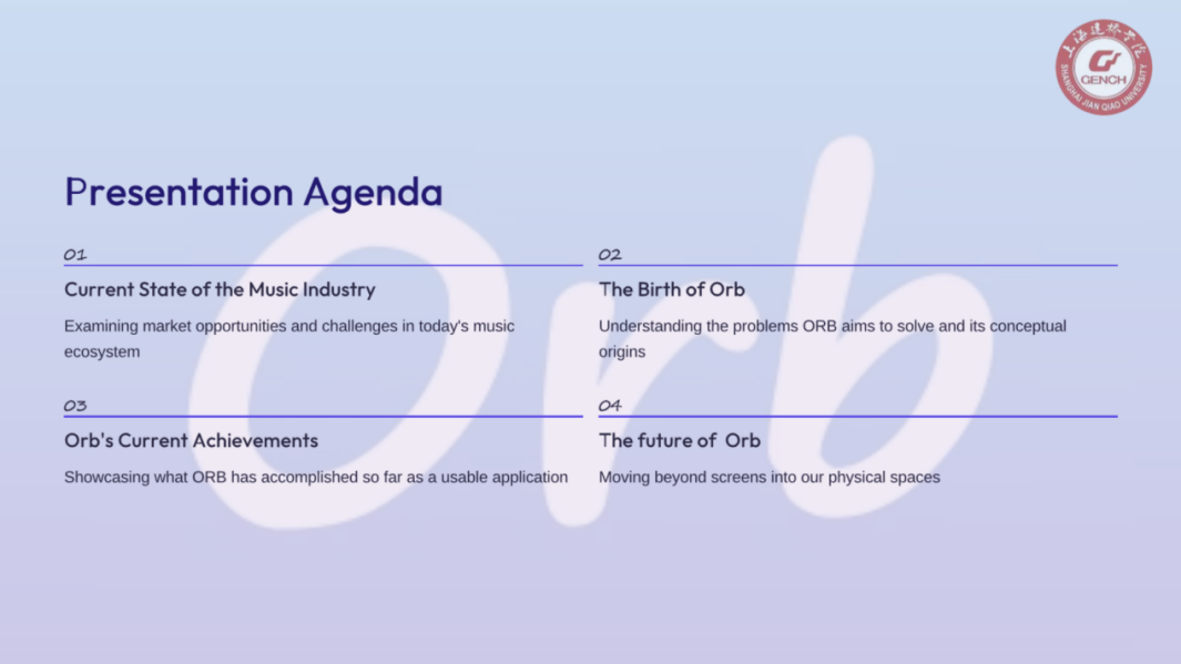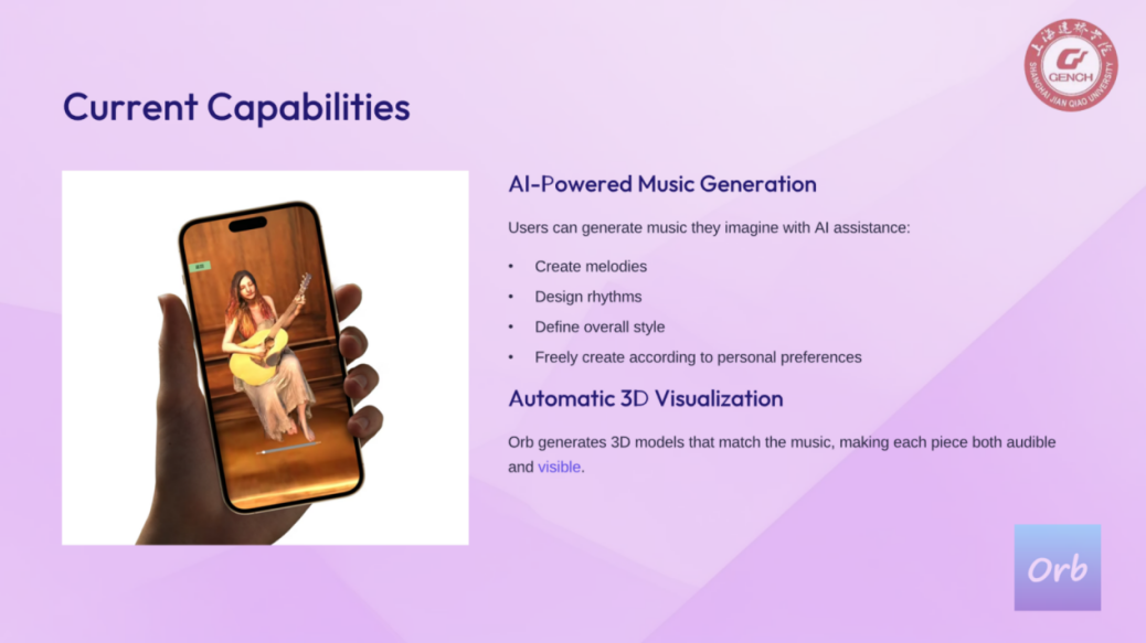 自AI发展以来,对音乐及传播行业产生了深远影响。在上海建桥学院新闻传播学院开设的选修课程《音乐经典与时尚演绎》,及全校公共素质选修课《全球时尚音乐鉴赏与创作》两门课程中,王彤老师引入了人工智能音乐创作的前沿教学内容,并带领学生们无门槛体验探索 AI 在音乐制作中的方法与潜力。这些课程不仅教授了技术操作,更激发了学生跨越传统与现代的创意思维,启发了学生们探索新领域,其中,吴旺阳同学思维敏捷,脱颖而出,创造性地将AI建模与AI生成音乐相结合。因而,课程的启发性及体验性设计,为Orb项目的诞生奠定了理论与实践的基础。
