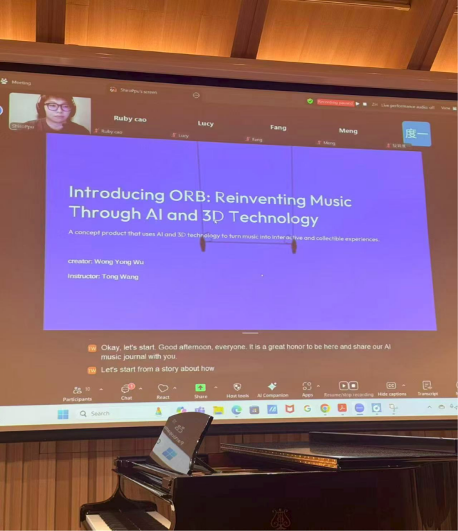 在国际舞台上,我校概念项目Orb取得二等奖。该项目由我校学生吴旺阳主导制作,并联合导师王彤指导完成。Orb的核心理念是探索 “音乐的触摸、拥有与互动”,通过AI技术与沉浸式体验的结合,让音乐不再只是听觉上的消费品,而是可以收藏、互动并赋予个性化表达的数字作品。在演示环节中,团队以具体案例展示了Orb如何突破传统与流媒体的局限,让观众重新找回与音乐的情感连接与归属感。不仅获得了全球现场专家学者的高度关注,也引发了对未来音乐生态的互动讨论。