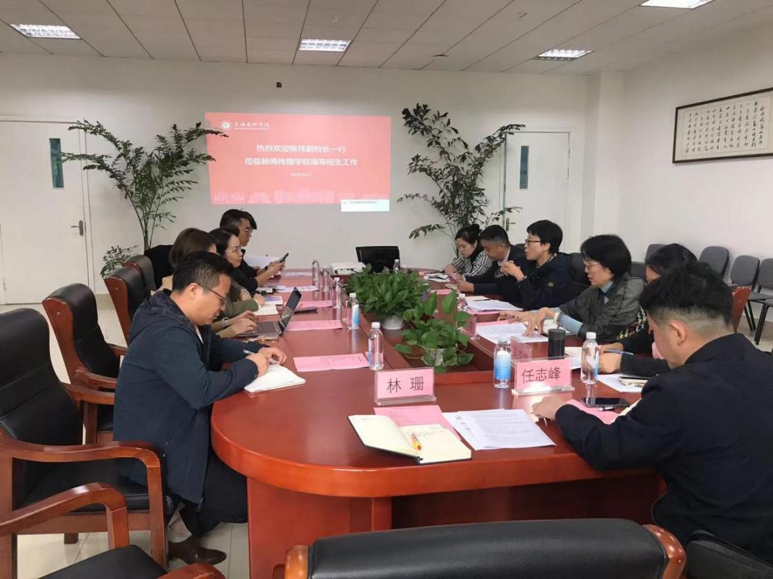 10月27日下午,上海建桥学院副校长陈伟、校长助理张巍、招办主任张磊、招办主任助理钟子健、招办专员颜世浩莅临新闻传播学院,调研指导学院招生工作,新闻传播学院全体党政领导以及招生工作联络员林珊参会。