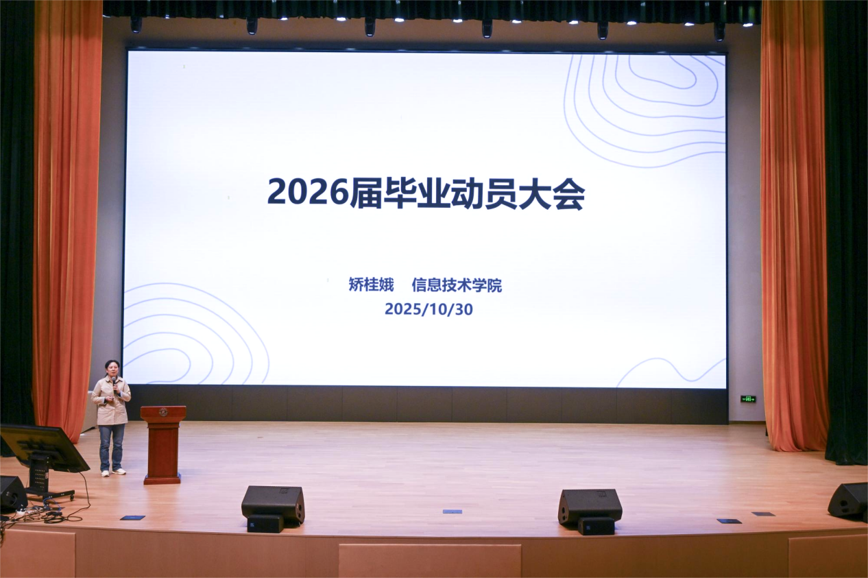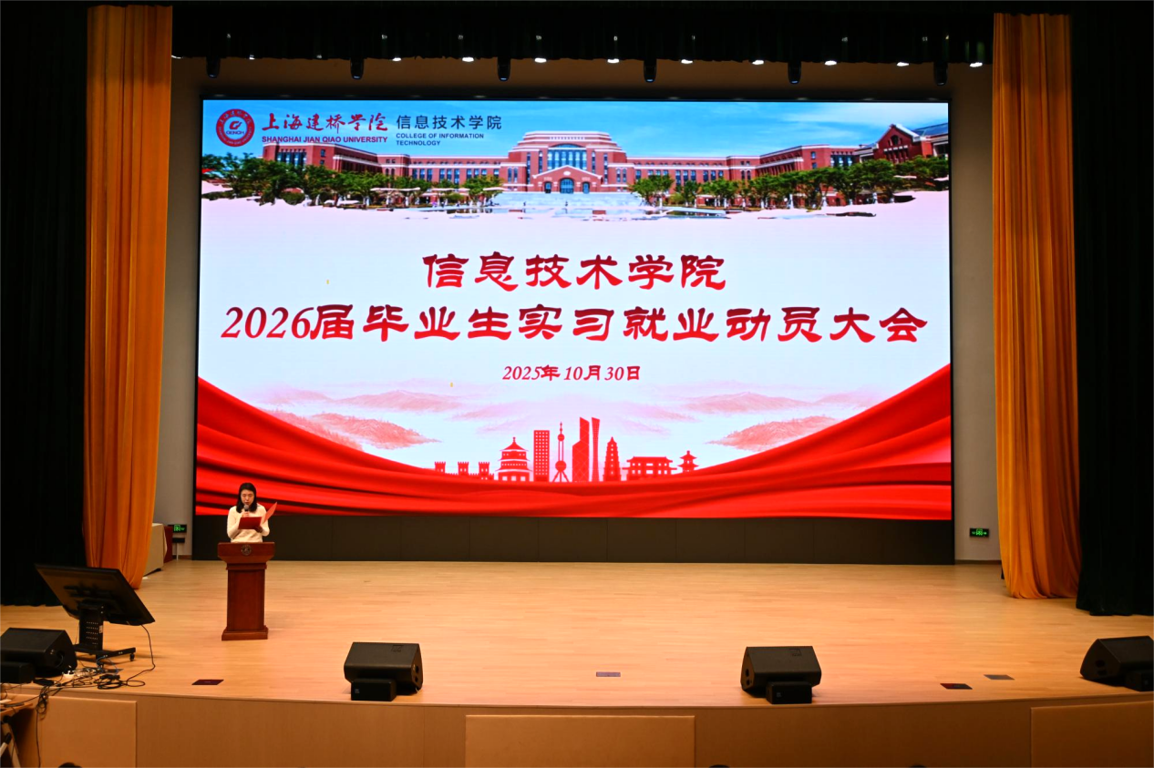 为深入贯彻落实党中央、国务院关于促进高校毕业生高质量充分就业的决策部署,助力毕业生明确发展方向、规划职业路径,10月30日,信息技术学院于大礼堂分本科、专升本两个场次召开2026届毕业生实习就业动员大会。学院党委书记杜鹃主持会议,副院长矫桂娥、副书记徐娜、征兵宣传负责人张峰、校友代表苏浩天、优秀学生代表张博冉、毕业班辅导员出席会议,2026届全体毕业生参会。