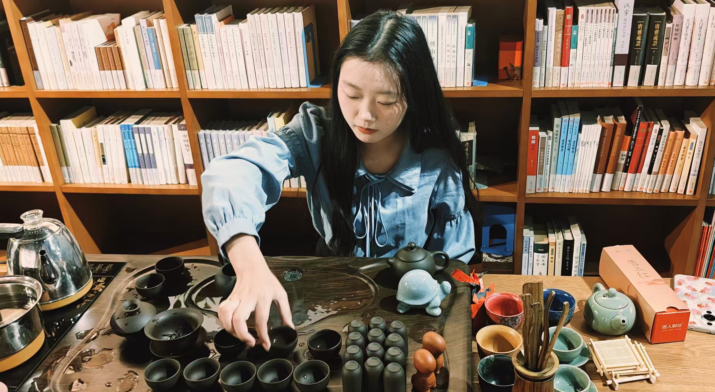 茶会伊始,“静心” 环节为整场活动奠定雅致基调。国学阅览室内,暖黄灯光柔和洒落,青瓷茶具整齐陈列,案几上点缀着素雅的绿植,淡淡的茶香与墨香交织。在刘晓老师的引导下,学子们轻闭双眼,伴着舒缓的古琴曲调整呼吸,暂时卸下学业的忙碌,让心绪逐渐沉淀,以平和的心态迎接这场文化盛宴。