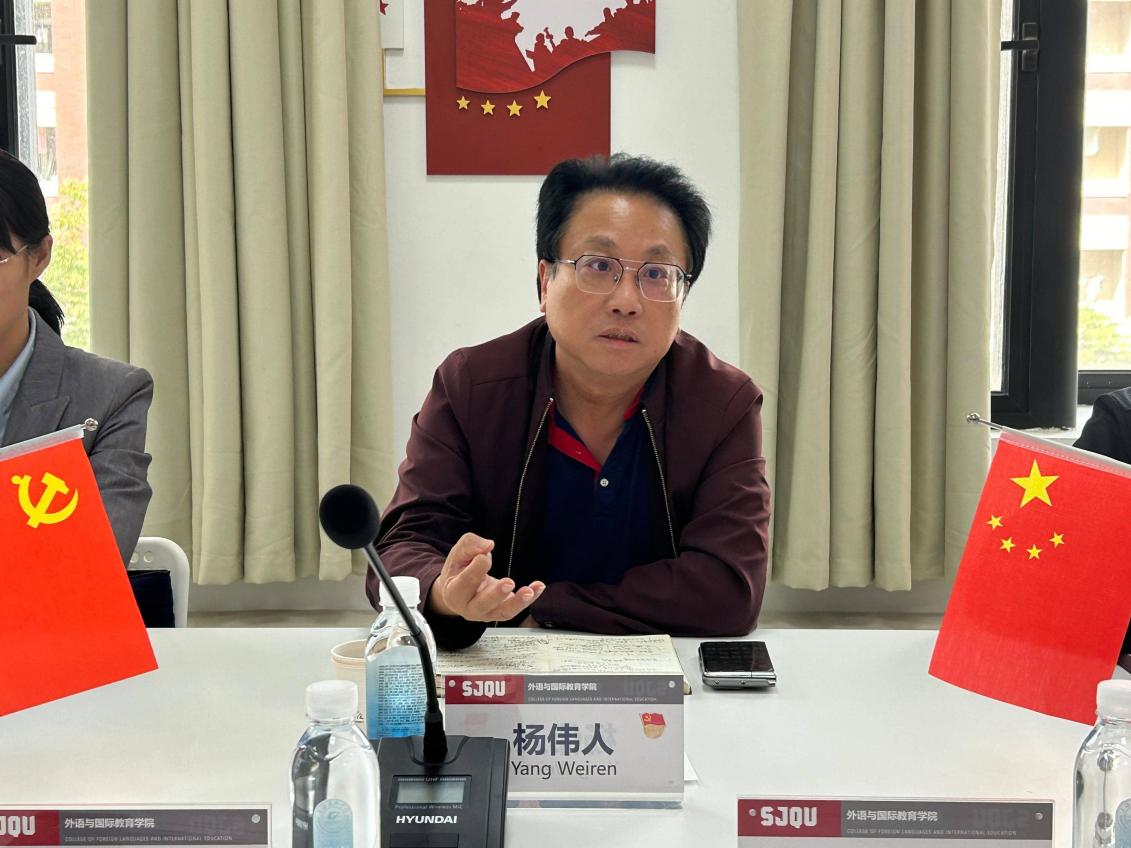 11月3日下午,校党委书记杨伟人带队,党委办公室主任、宣传部部长桑正,党委组织部副部长、教师工作部副部长潘明芸,党委办公室主任助理、宣传部部长助理徐光硕和对外交流办公室冯小珊一行,莅临外语与国际教育学院调研指导工作。外语与国际教育学院全体党政领导班子出席,本次会议就三院合并进展情况、产教融合推进情况和党建工作开展情况等问题展开交流研讨,会议由学院党委书记王晨岑主持。