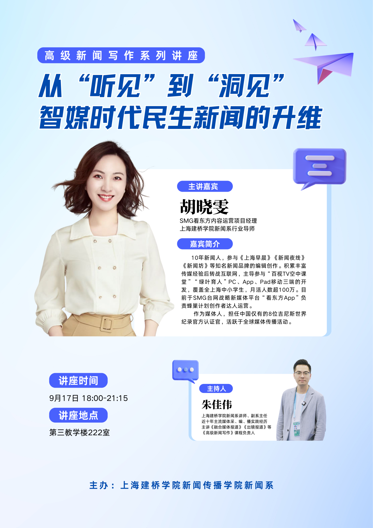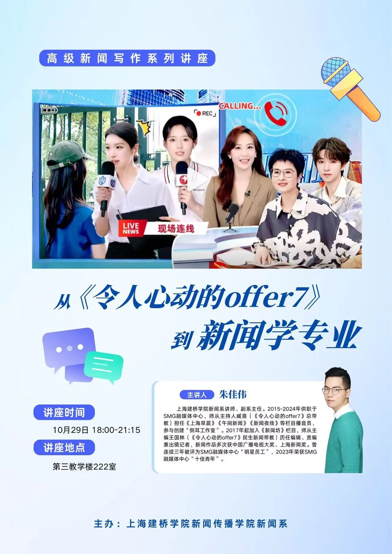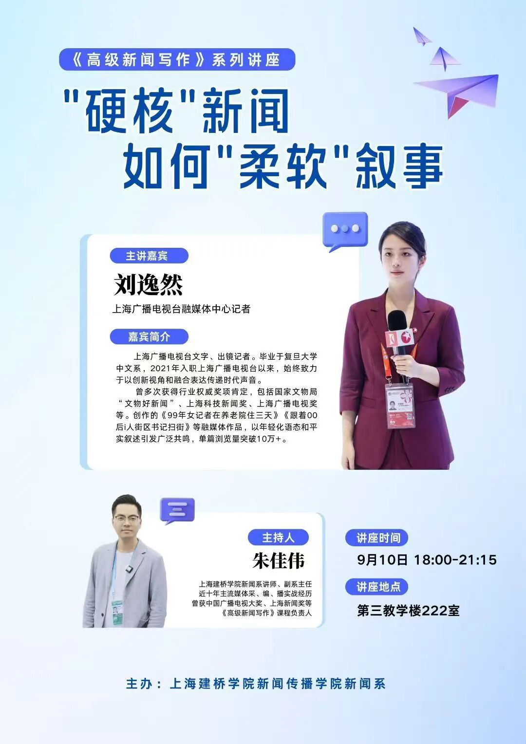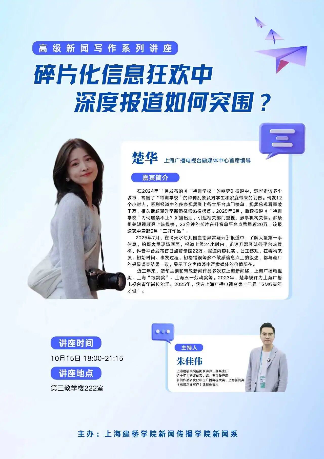 作为上海市一流本科专业,上海建桥学院新闻系紧密围绕应用型人才培养定位,一直都很重视学生实践能力的系统塑造。不仅在校内构建了体系化的实践教学平台,还积极拓展校外实习基地,通过多元的真实场景与实战项目,强化学生的专业实操技能与行业适应力。而从去年开始,依托大三年级的《高级新闻写作》课程,建桥新闻系又系统性引入业界讲师,将行业最前沿的实践现场直接“搬”进课堂。