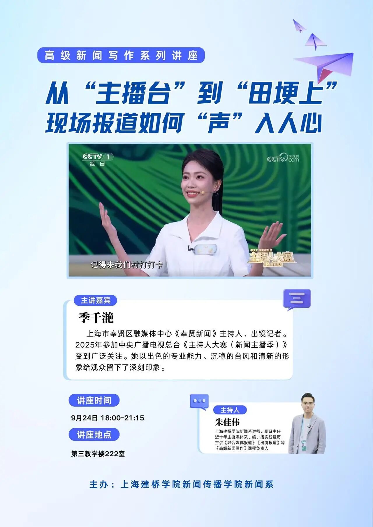 SMG青年记者刘逸然带着《99年女记者在养老院住三天》的爆款短视频解析“硬核新闻的柔软叙事”;刚从央视主持人大赛归来的奉贤区融媒体中心记者季千滟带领学生模拟现场报道;五星体育互联网运营总监施如顺以“超级杯赛前报道”为主题开展随堂测试……刚刚过去的1个多月里,上海建桥学院新闻系正用一个个沉浸式实战课堂,重构新闻教育的边界,打通从课本到现场的实践教学“最后一公里”。