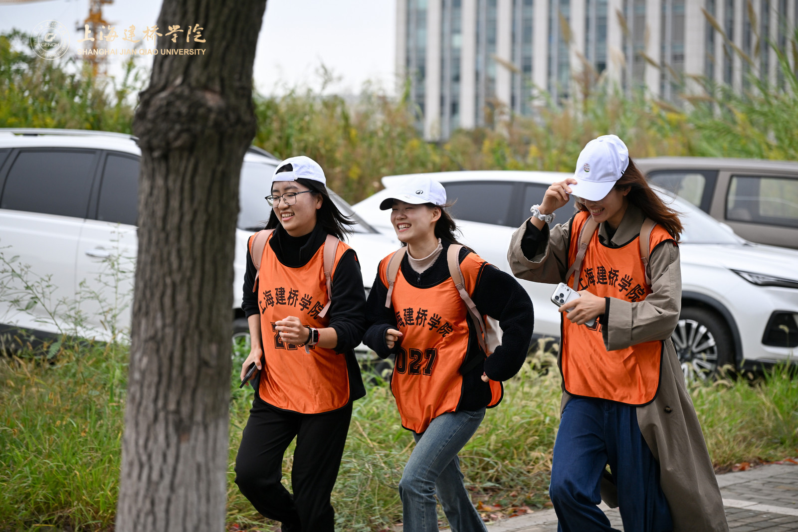 在健步走热身环节,体育部赵龙龙老师带领全体参与者进行了八段锦热身。参赛选手们按分工会为组别依次出发,穿着印有“上海建桥学院”标识的橙色马甲,穿梭于秋色斑斓的树荫大道,形成一道流动的风景线。队伍沿途经橄榄路、沪城环路、海港大道,海基六路,见证海洋大学、海事大学、海立方、信息飞鱼园区、智能网联汽车综合测试示范区等临港现代化地标,全程6.3公里。道路两侧层林尽染,树叶在秋风中沙沙作响,与教职工们的欢声笑语交织成一曲动人的秋日交响。