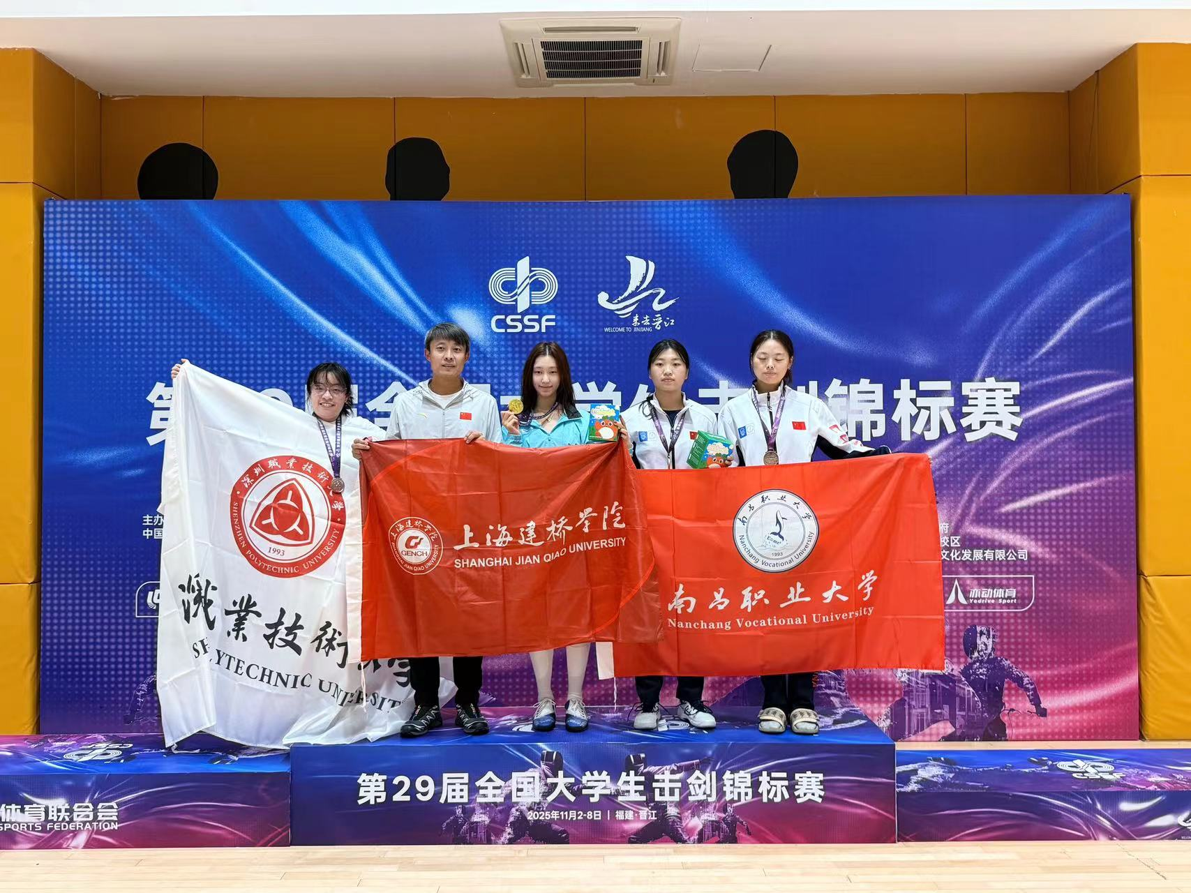 女子佩剑团体季军24级数字媒体许曼琦、23级视觉传达袁缘、24级空乘蒋倩雯、25级空乘陈慕格