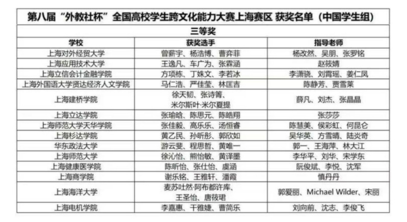 第八届“外教社杯”全国高校学生跨文化能力大赛上海赛区复赛圆满落幕,上海建桥学院参赛团队凭借出色的综合表现、鲜明的案例特色与稳步提升的竞技水平,成功斩获上海市三等奖!本届大赛参赛院校云集、选手整体素质创历年新高,我校学子在激烈角逐中脱颖而出,既收获了沉甸甸的荣誉,更实现了较往年在得分、排名及综合表现上的全面进步,充分展现了建桥学子勇于挑战、笃行不怠的成长姿态。