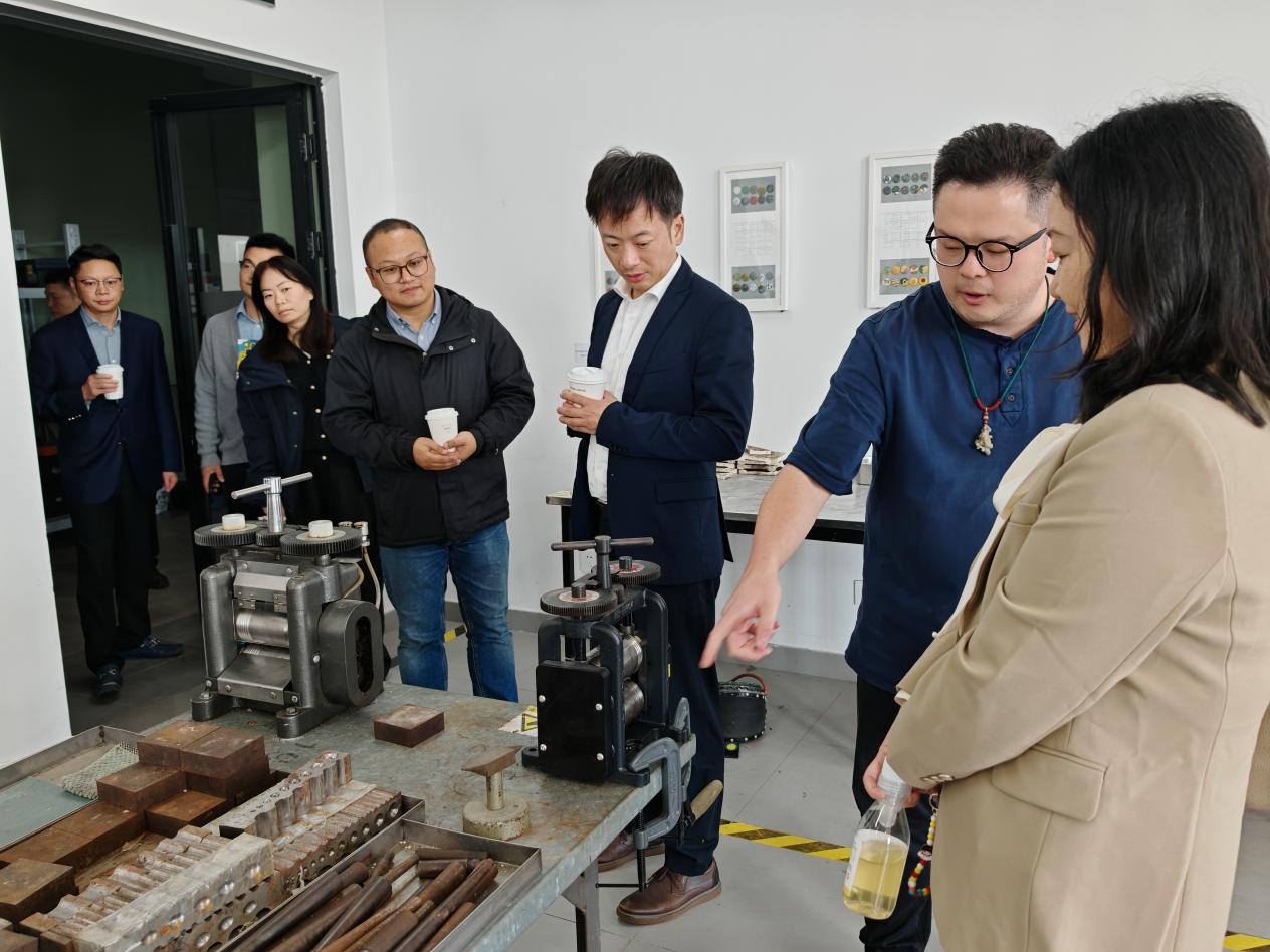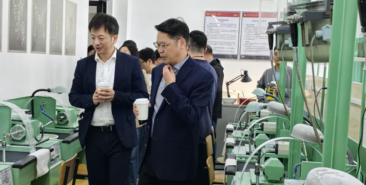 一行人首先实地走访了珠宝学院多个专业化实践教学场所,依次参观了宝石加工、玉雕、金属加工、宝石鉴定、钻石鉴定、首饰制作、蜡雕浇铸、首饰设计等实践实验室,以及大型仪器共享平台和珠宝检测中心。过程中,调研团队详细了解了学院在宝石及材料工艺学、珠宝首饰设计、奢侈品管理等专业的人才培养模式、课程体系建设及产教融合成果,并对学院依托实践平台提升学生创新创业能力的做法表示肯定。