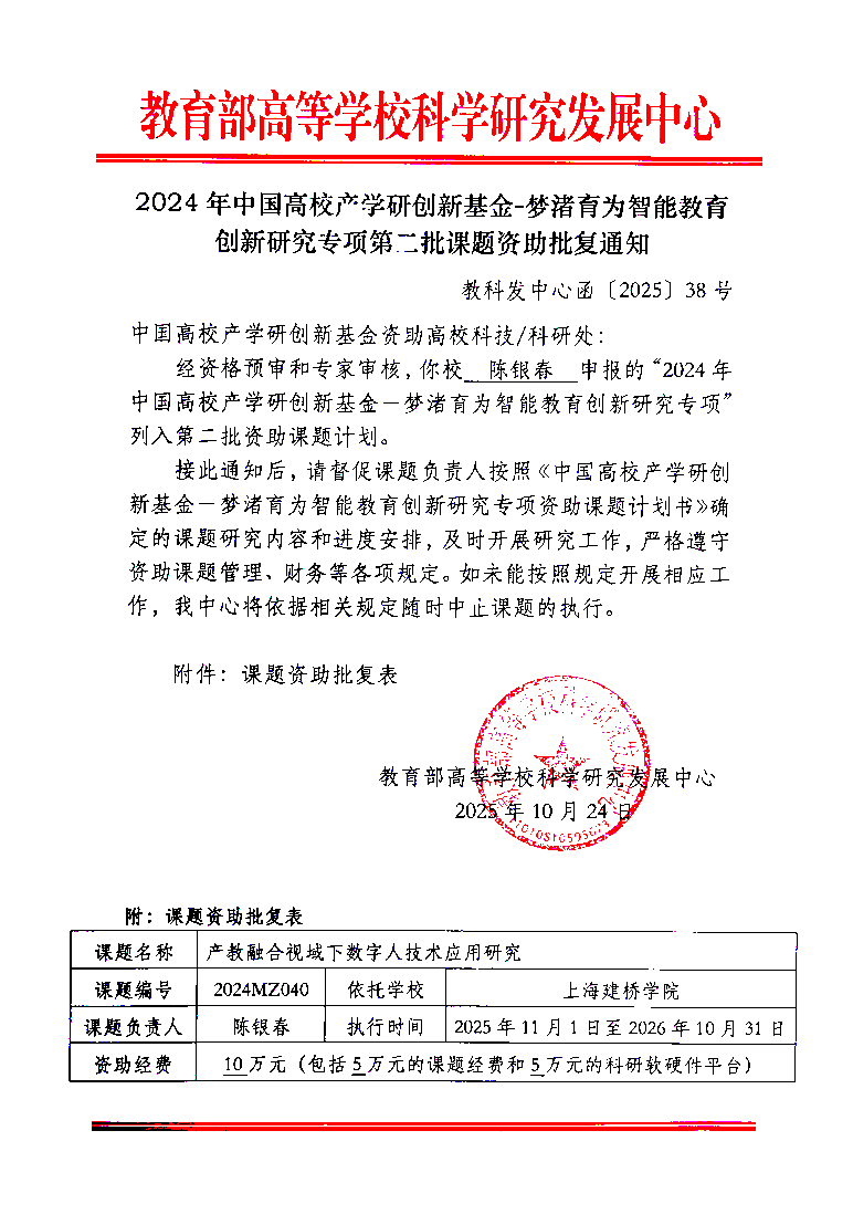 近日,教育部高等学校科学研究发展中心正式公布立项名单,建桥外语与国际教育学院陈银春教授牵头申报的《产教融合视域下数字人技术应用研究》课题,在激烈的全国竞争中脱颖而出,成功获批2024 年中国高校产学研创新基金 - 梦渚育为智能教育创新研究专项”第二批课题资助。该项目将获得总额10万元的经费及科研软硬件平台支持,标志着学校产学研融合研究领域取得的重要突破。