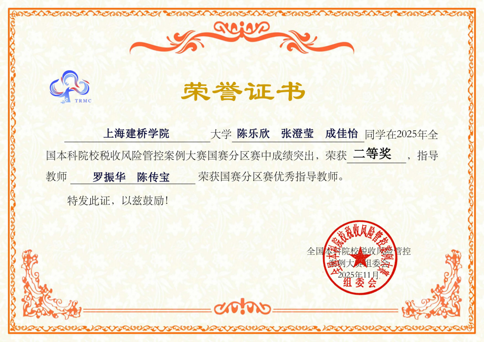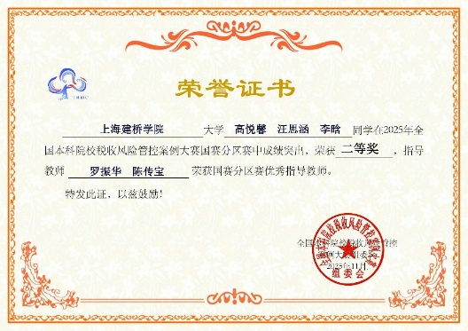 2025年7月至11月,我校商学院精心组织了校级选拔赛,从中挑选出30名优秀学生,他们被分为10支队伍,代表我校参加了备受瞩目的2025年全国本科院校税收风险管控案例大赛。这一大赛旨在深化税收征管改革,推动税法知识进校园,并通过竞赛形式促进税务师行业与高校的产教融合,培养学生的综合素质和解决问题的能力。在商学院罗振华、任向平、骆巧云、罗燕晖和张婉琳等多位老师带队指导下,会计系学生凭借扎实的专业知识、高水平的分析能力和团队合作精神,顺利完成了比赛并取得了优异成绩,获得上海市二等奖3项,三等奖3项。