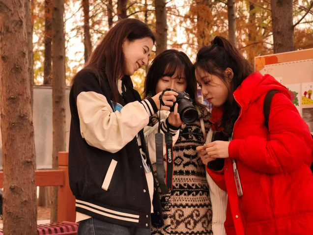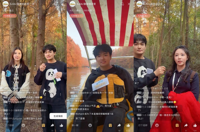 在秋意盎然的“森林课堂”中,学生围绕摄影、短视频创作、移动直播等方向分组展开实践。从前期策划、现场采拍到实时直播,师生与业界导师共同研讨、协同作业,实现了理论与场景的深度融合。直播小组通过“SJQU融媒创造营”视频号进行接力直播,累计观看近千人次,评论区互动踊跃;摄影与短视频小组产出的作品,也将有机会经由合作媒体平台进行展播,推动教学成果走向社会传播。