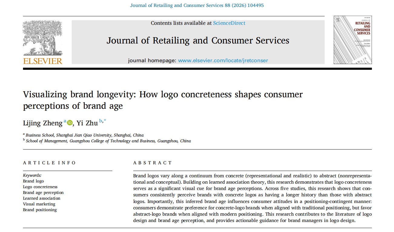 其中,郑丽菁博士以第一作者身份在国际权威期刊《Journal of Retailing and Consumer Services》(SSCI中科院1区)发表题为《品牌标志的具象性对消费者品牌年龄感知与态度的影响》的研究论文,揭示了品牌标志设计背后的消费心理密码:具象logo使消费者更容易认为品牌更“老牌可靠”,而抽象logo则更显“现代创新”。品牌定位在此过程中起调节作用,传统定位的品牌更适合采用具象logo,现代定位的品牌则更适配抽象logo。该成果在品牌设计与消费者认知领域具有重要的理论与实用价值。