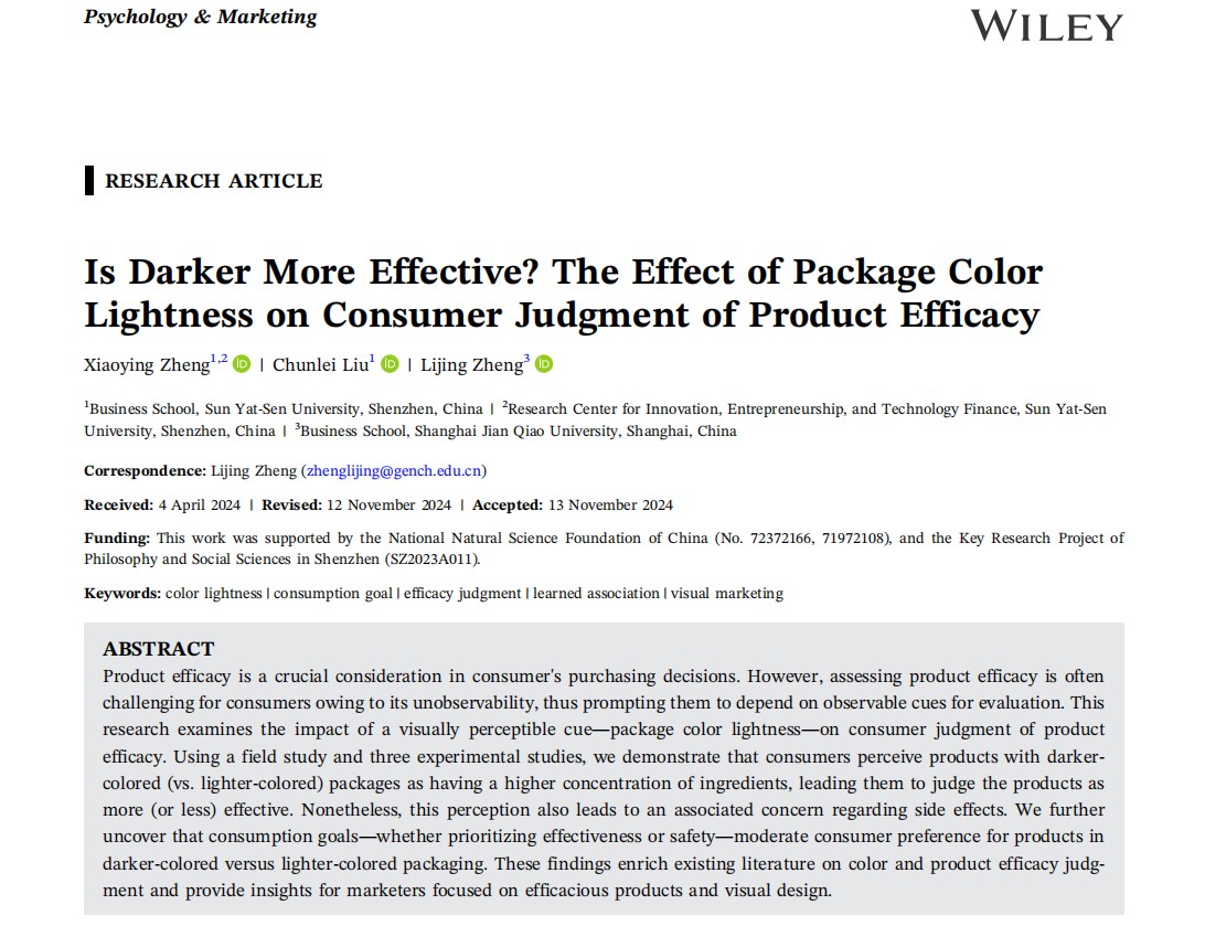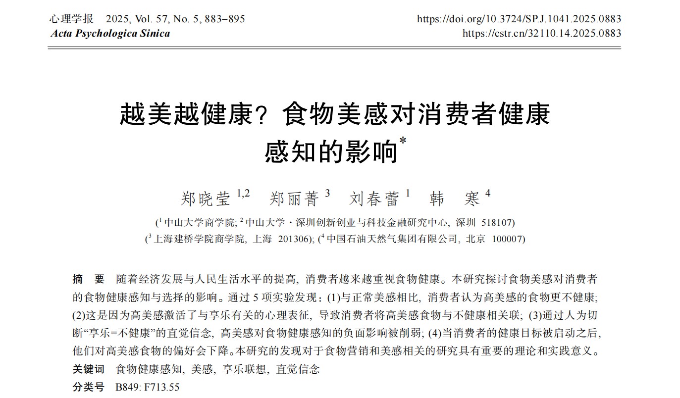 郑丽菁博士另有三项研究成果相继发表于国内外重要期刊:在《Psychology & Marketing》发表论文揭示了产品包装颜色的深浅会微妙影响消费者对功效与安全性的判断;在《Frontiers in Psychology》探讨了服务机器人的性别化设计如何影响人们与之协作的意愿;在《心理学报》分析了食物的视觉美感如何提升人们对健康价值的感知。这些研究均围绕消费者行为与人机交互展开,展现了应用心理学在营销与管理领域的巨大价值。