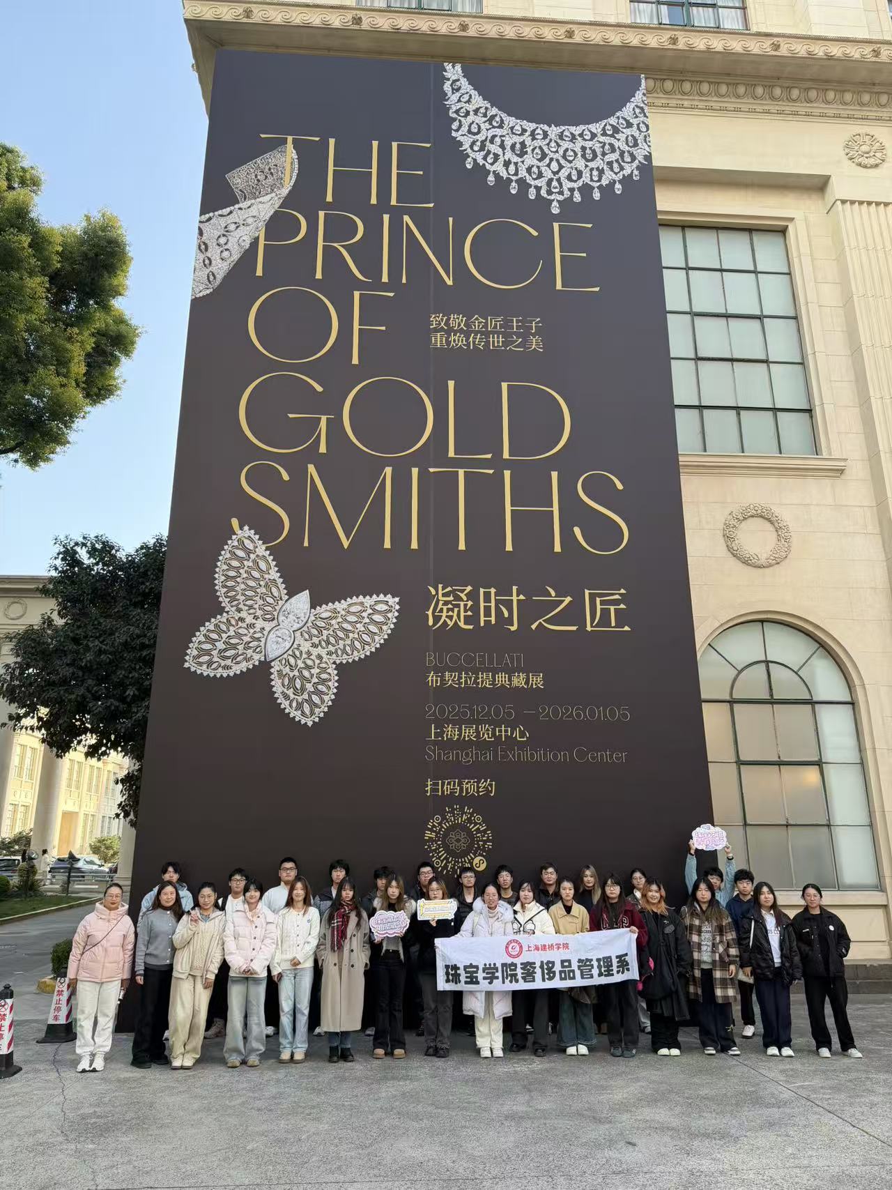 本次由珠宝学院奢侈品管理系组织、B25-1班全体28名同学共同参与的系列专业实践活动已圆满结束。活动分为两个紧密衔接的环节:首阶段为南京西路奢侈品商圈市场深度调研,第二阶段为上海展览中心《凝时之匠-布契拉提典藏展》的沉浸式观展学习,形成了“市场洞察-工艺溯源”的完整学习闭环。