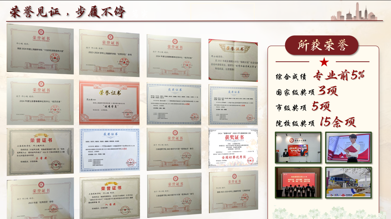他历任校团委雷锋青年志愿者协会干事、2024年度上海建桥学院学生资助宣传大使、院文明修身学导等职务。现担任班级团支书、院党建中心副主任、2025年度上海建桥学院学生资助宣传大使等职务。曾获国家励志奖学金、2024上海市资助育人主题征文三等奖(市级)、中国国际大学生创新大赛(2025)市赛铜奖。