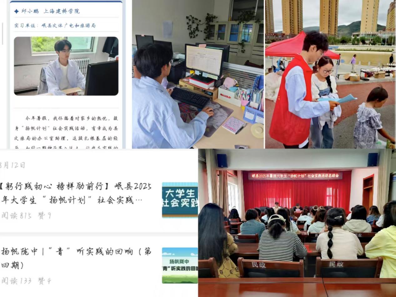 大二暑假,他参与“扬帆计划”大学生社会实践,在岷县文体广电和旅游局担任办公室助理期间,主动投身各项基层活动,用脚步丈量家乡需求,用专业知识助力基层发展,凭借优异表现,他最终获评“优秀社会实践大学生”荣誉称号,并作为优秀代表在总结会上发言,相关事迹被团县委、团市委公众号报道。
