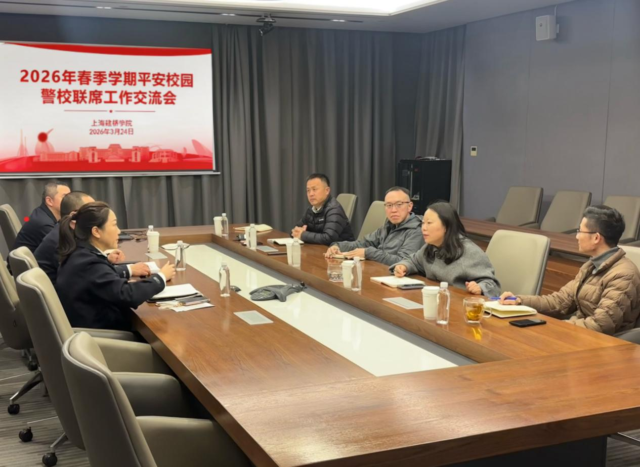 为进一步健全警校协同联动机制,凝聚校园安全共治合力,切实筑牢平安校园安全防线,3月24日上午,上海建桥学院召开2026年春季学期平安校园警校联席工作交流会。临港新城派出所所长周少诚、临港高校派出所所长胡燕、临港高校派出所警官徐锋,学校校长助理丁哲寅,后勤保卫处处长杨真真、副处长提文超,学生处副处长刘雍鹤及学校安全相关工作人员出席会议。