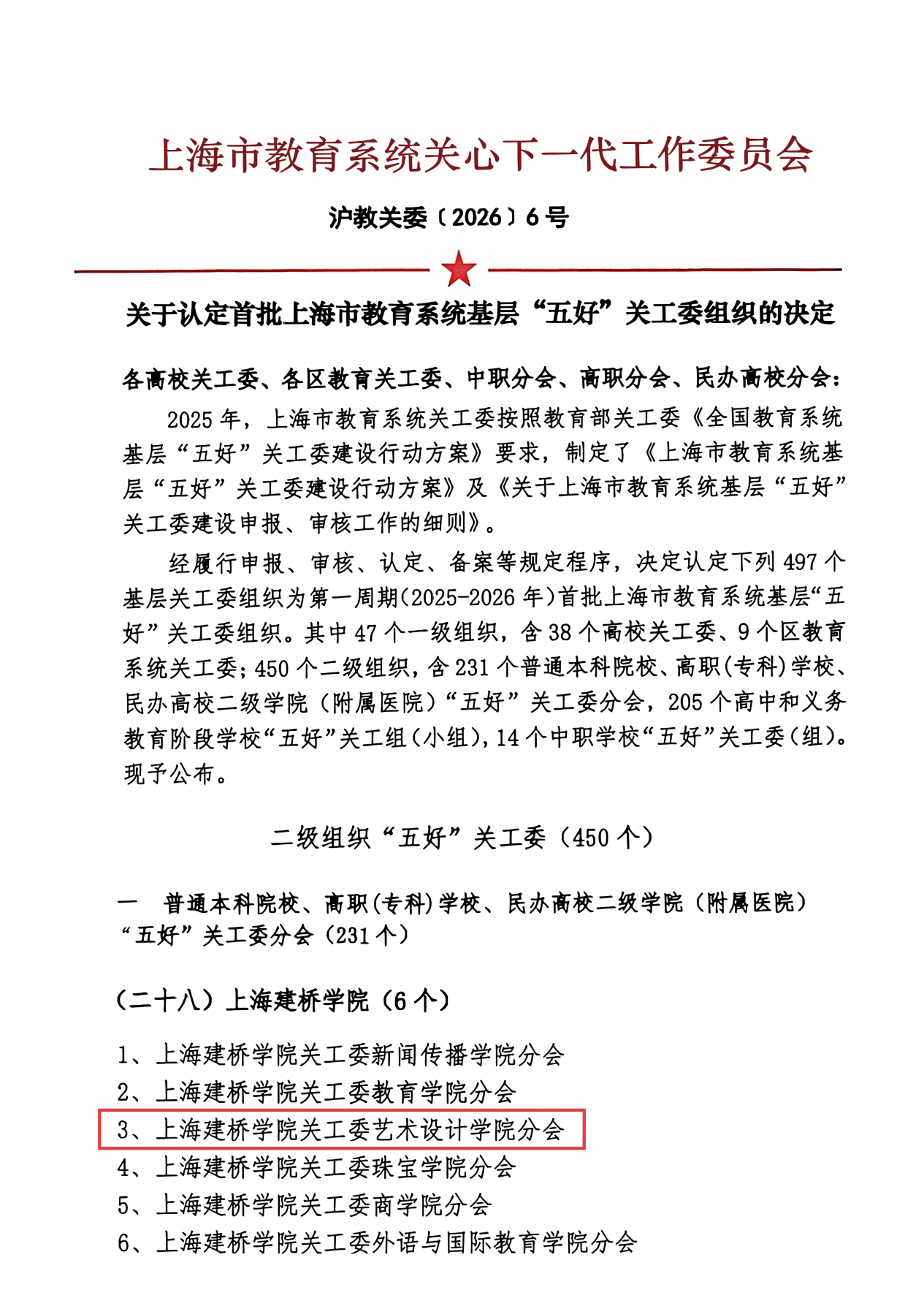 近日,上海市教育系统关心下一代工作委员会公布第一周期(2025-2026年)首批上海市教育系统基层“五好”关工委组织认定结果,上海建桥学院关工委艺术设计学院分会成功入选,标志着学院关心下一代工作迈上新台阶。