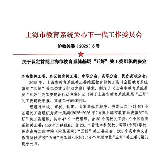 近日,上海市教育系统关心下一代工作委员会印发了《关于公布2025年上海市教育系统基层“五好”关工委组织名单的通知》(沪教关委〔2026〕6号)。在公布的名单中,上海建桥学院关工委珠宝学院分会光荣上榜,被认定为首批“上海市教育系统基层‘五好’关工委组织”。这一荣誉不仅是对我院关工委工作的充分肯定,更是对我院育人工作的莫大鼓舞。