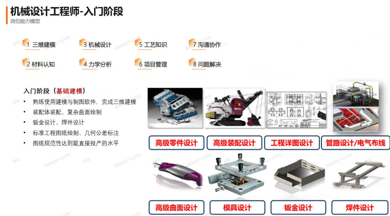 机械设计师不仅要负责产品从概念到生产的全过程设计,还肩负着提升产品竞争力和市场适应性的重任。8项核心能力包括三维建模、材料认知、机械设计、力学分析等,三阶段为“入门—进阶—专家”横向递进。为此,学院重构了三阶递进式培养方案(基础能力夯实期→专项能力强化期→综合能力实战期),配套开发了多门项目化实战课程(如双层倍速链流水线、折叠机等),构建了调研—标准—课程—实战—评价的项目化课程开发标准,形成了校企协同、课证融通、赛教结合的机械设计工程师岗位嵌入式人才培养体系。