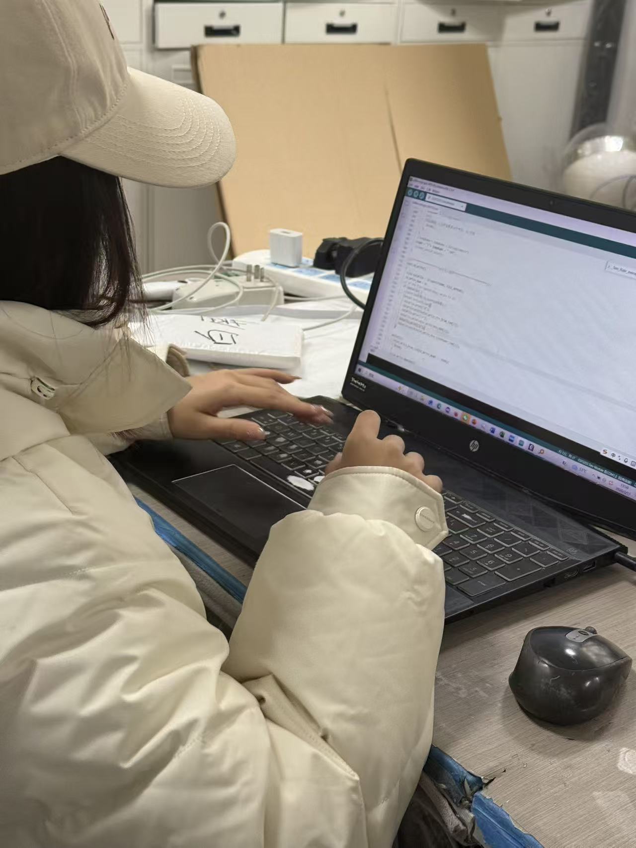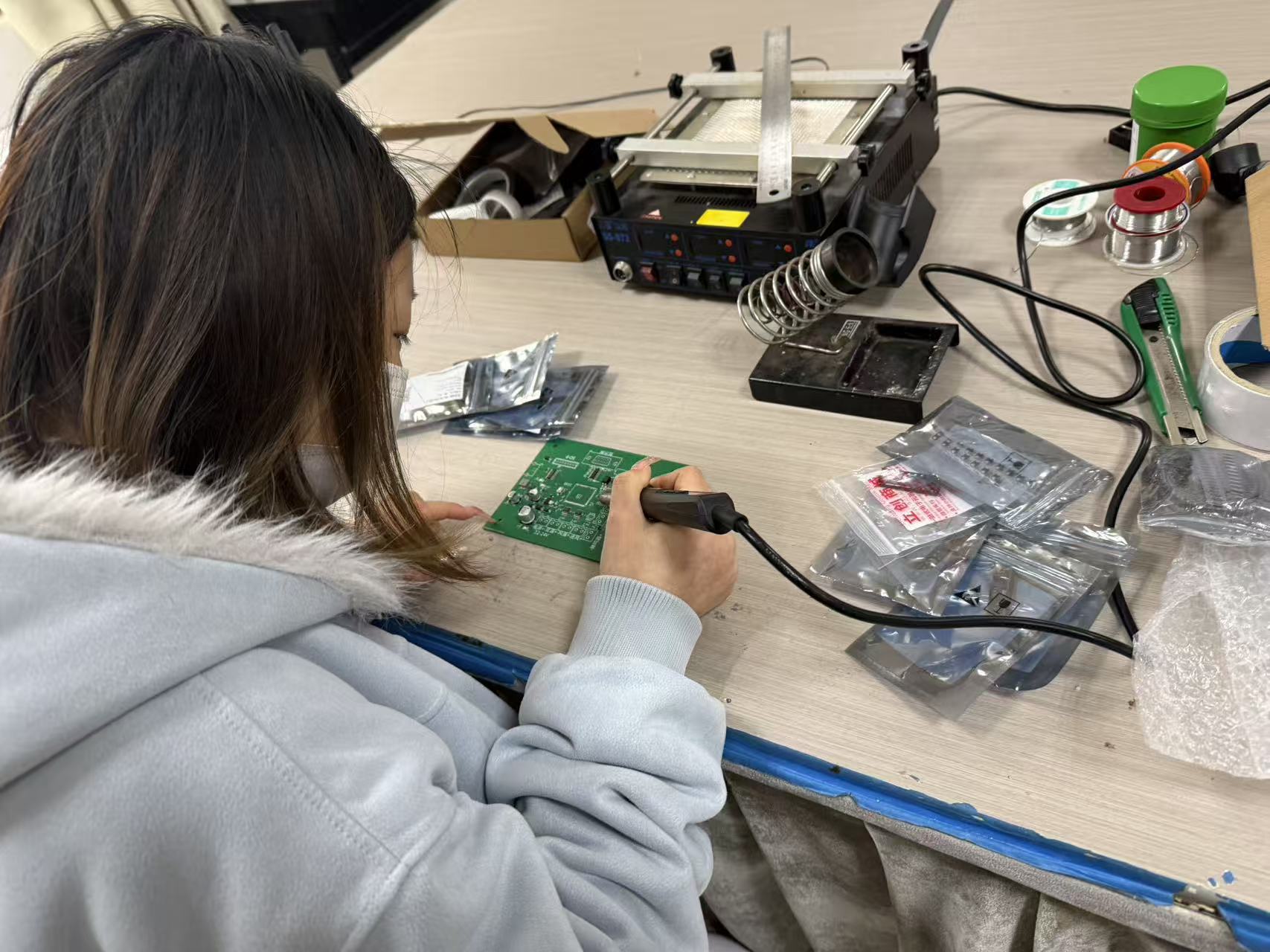 谈及项目经历,三位同学感触颇深。郭乐乐回忆道,“从画原理图、焊板到一遍遍调试豆温、风压、火力参数,再到把文件保存功能做稳,每一个bug都是成长。展会前一天的紧急调试,让我们真正感受到产业项目对精度和效率的高要求,也让我们明白,只有把技术做扎实,产品才能经得起市场检验。”杨雪则感慨,这次项目让她和同学们走出课本,直面真实产品研发的全过程,“调试各项参数不仅锻炼了动手能力,更培养了严谨细致的工程态度”。未能到展会现场的娄广亚同样收获满满:“从实验室研发到展会前装机交付,我们全程参与、全程负责。虽然没能到现场,但得知亲手做的电路板得到行业认可,我们倍感自豪,也更加坚定了学好专业的信心。”