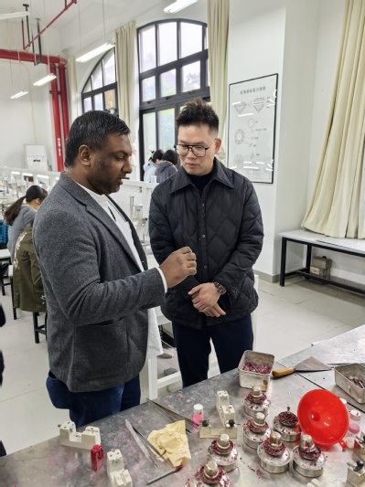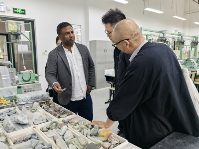 2026年4月14日,上海古澜国际贸易公司总经理张电信携斯里兰卡宝石企业CEO ASSAYED先生一行,到访珠宝学院开展参观调研与合作洽谈,旨在深化校企协同、拓展国际合作,推动珠宝专业人才培养与产业发展深度融合。学院党总支书记王苇、珠宝艺术中心主任王潮参与接待,双方围绕多项合作事宜展开深入交流,达成系列初步共识。