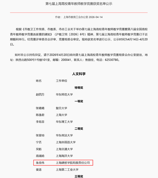 在近日举办的第七届上海高校青年教师教学竞赛中,新闻传播学院教师朱佳伟凭借扎实的教学功底、创新的课程设计与鲜明的产教融合特色,从全市65所高校的275名参赛教师中脱颖而出,荣获人文科学组二等奖。这也是除高职高专组别外,唯一跻身二等奖及以上行列的民办高校教师。