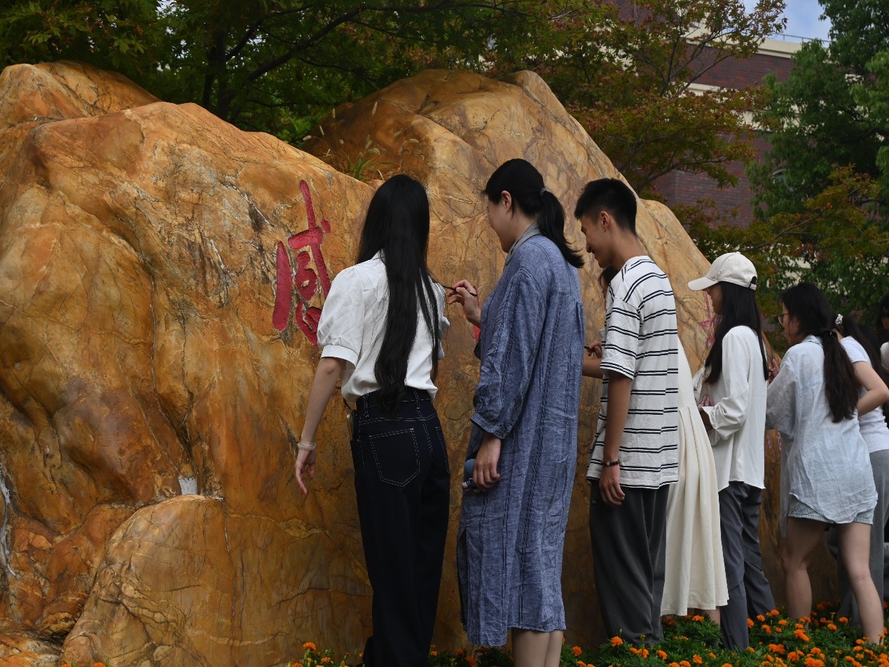 不同刻痕深度需要不同的工具,就像教育要因材施教一样,作为一名教师,不仅要传授知识,更要以身作则,培养学生树立正确的人生观、价值观和世界观。师生共同描红校训石,让社会主义核心价值观通过具象化的方式浸入每个师生的心灵。活动结束后,师生纷纷在校训石前合影留念,这记录下了师生共同描摹的温馨瞬间,也成为师德师风建设的生动见证。