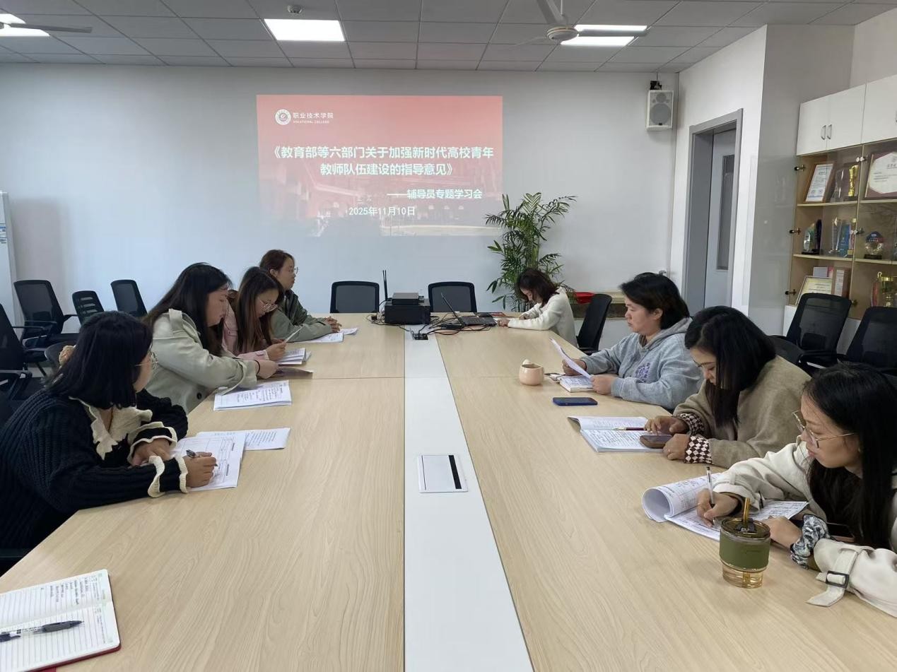 为深入贯彻习近平总书记关于高校思想政治工作和教师队伍建设的重要论述精神,落实教育部等六部门印发的《关于加强新时代高校青年教师队伍建设的指导意见》(以下简称《意见》)及高校辅导员队伍建设相关要求,切实把辅导员队伍建设作为落实立德树人根本任务的关键抓手,11月10日上午,职业技术学院学工团队在学院会议室419举行专题学习活动。学院党委副书记马冯莉主持,全体辅导员参加。