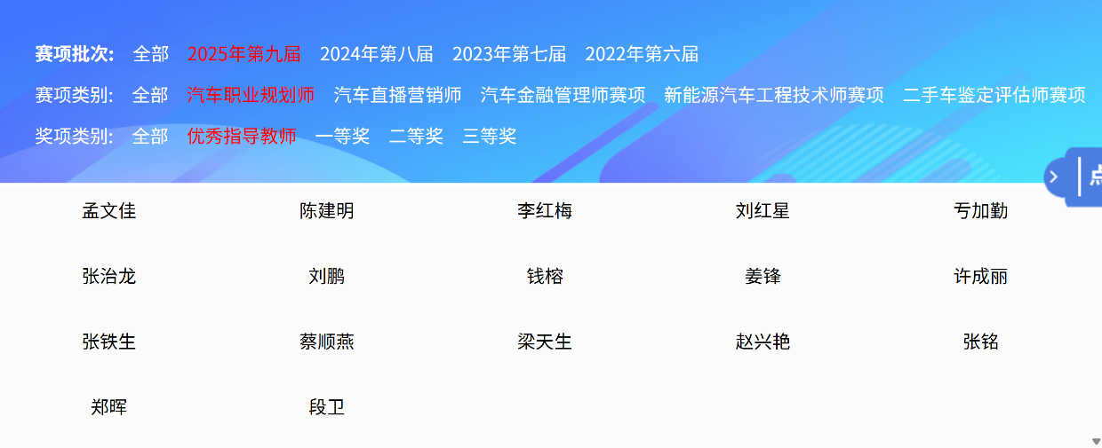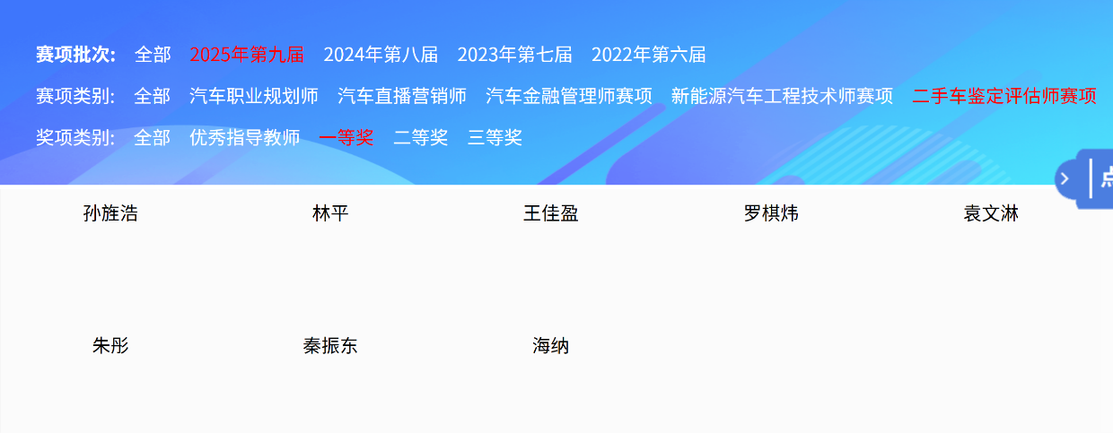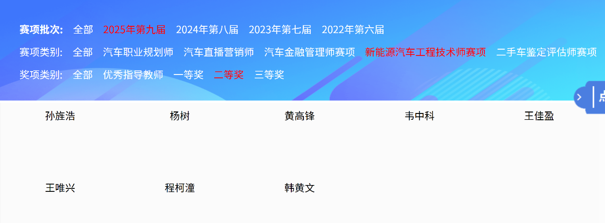 由梁天生、张铭老师指导的学生孙旌浩、王佳盈同学在新能源二手车鉴定评估师赛项和新能源汽车工程技术师赛项中荣获一等奖和二等奖;程柯潼、韩黄文同学在新能源汽车工程技术师赛项中荣获二等奖。