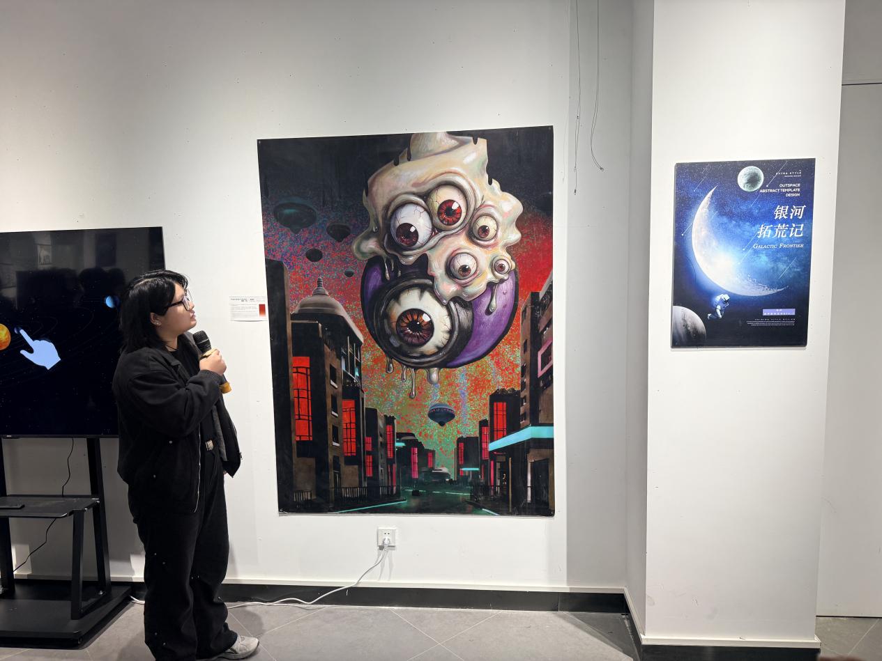 随后,Martin Dörbaum教授对本次展览进行介绍。据悉,本次展览的作品以“海洋与太空”为核心创作方向,均为艺术设计学院大师工作坊学员的创作成果,涵盖领域广泛,表现形式丰富多元。同学们巧妙运用传统手工艺、废旧材料改造等传统媒介,结合AI生成、交互装置等现代技术,打造出一系列兼具观赏性与思想性的作品。每个小组代表随后依次向师生们详细介绍了作品的创作理念、展示形式与核心内涵,现场作品亮点纷呈,从不同角度诠释了“太空中的艺术与设计”的主题。