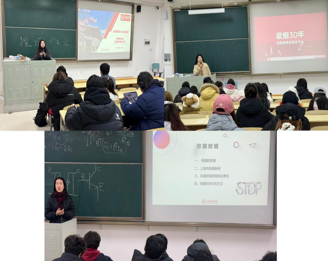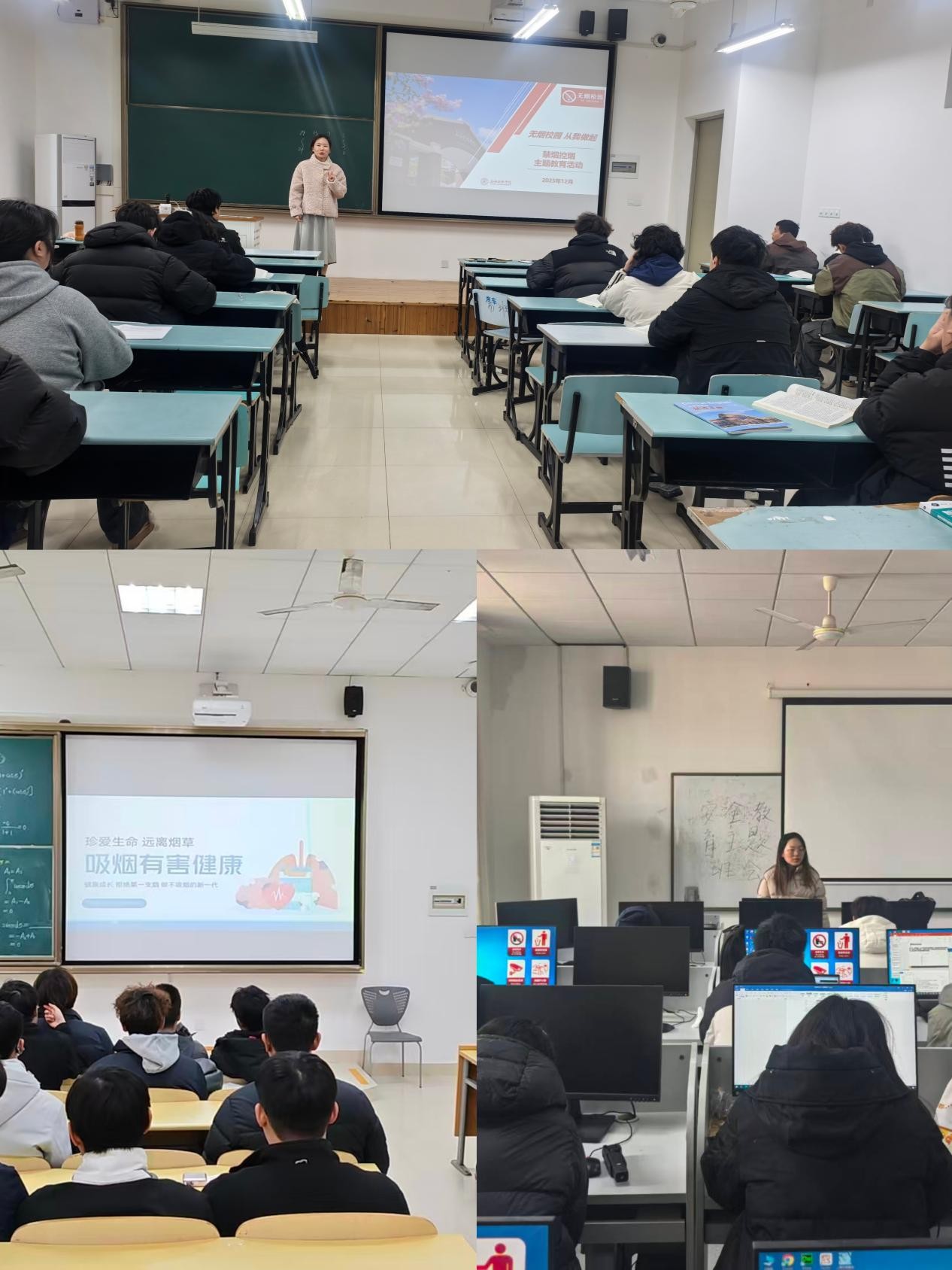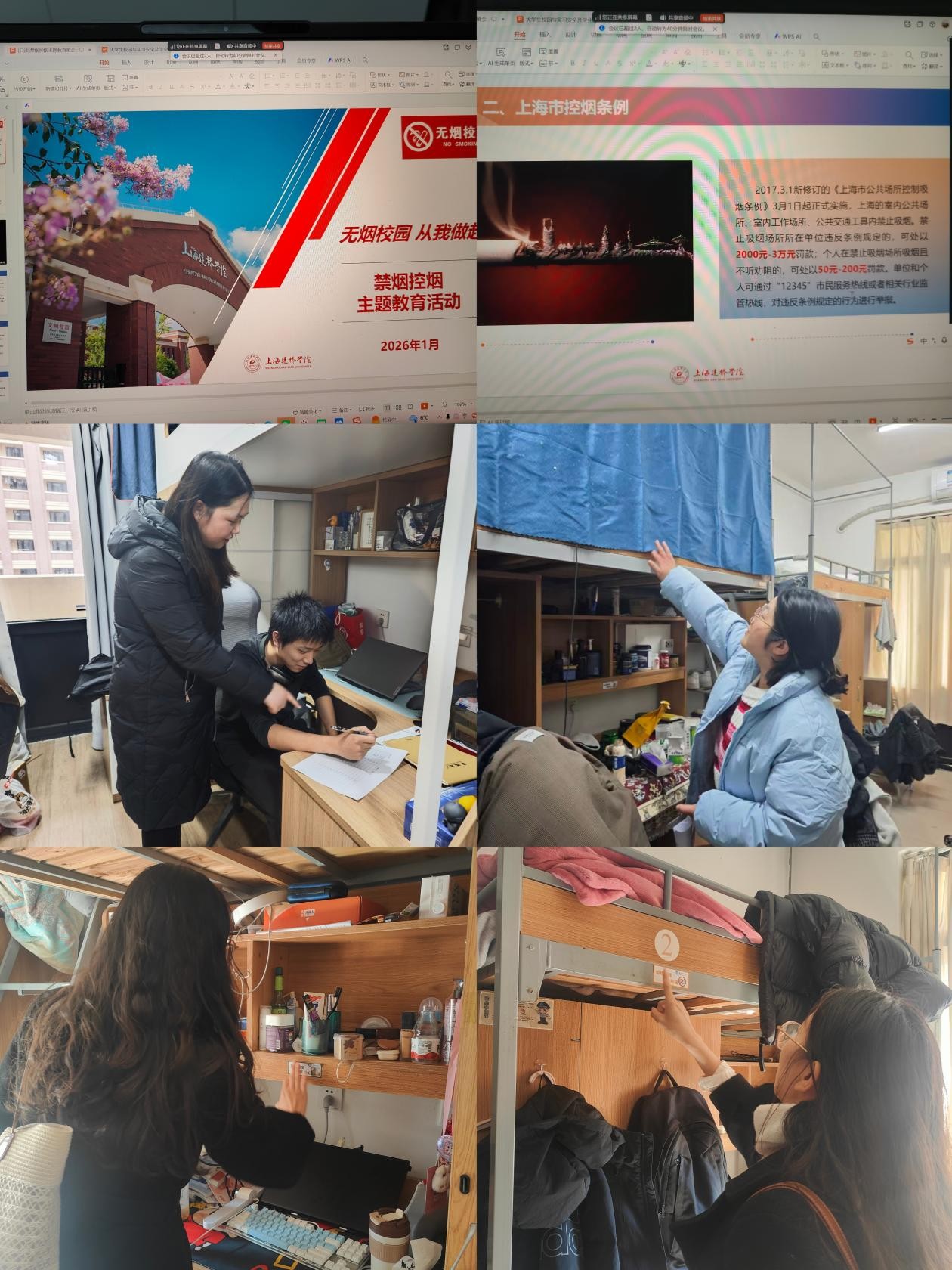 各针对不同年级学生特点,各年级辅导员协同推进精准化控烟举措:毕业班聚焦实习返校学生群体,强化宿舍控烟专项督查与隐患排查;新生班将控烟教育融入入学适应引导体系,从源头夯实健康生活习惯基础;大二年级通过案例研讨、控烟倡议签名、主题分享等活动,深化学生对控烟工作的认知认同。辅导员通过走访宿舍、线上答疑、装箱隐患排查等方式,及时发现并纠正不规范行为,确保控烟宣传教育到位、学生知晓到位、监督落实到位。