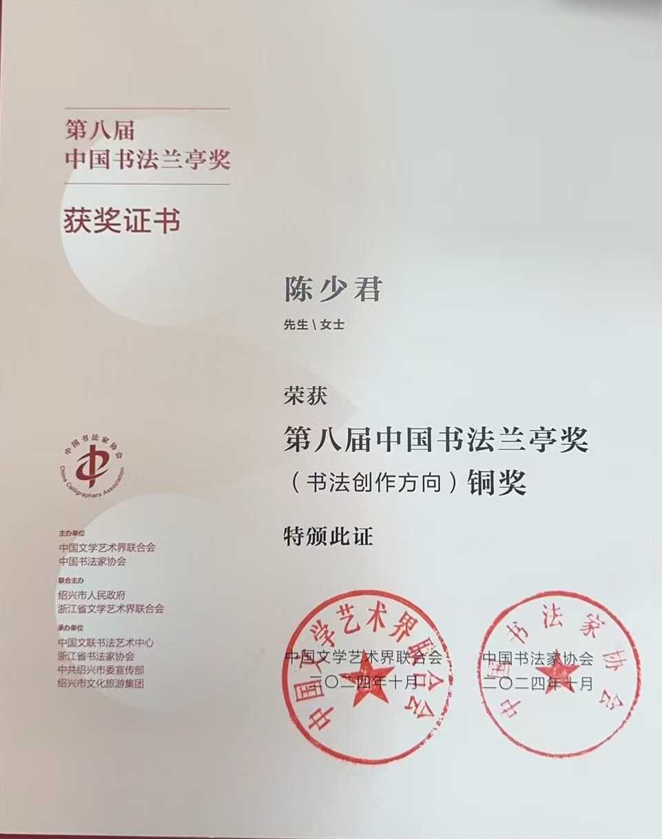 身为中国书法家协会会员,上海市书法家协会会员,陈少君在创作与教学两条路径上并行不辍。在“网红书风”盛行的当下,陈少君的选择显得有些“不合时宜”。他潜心钻研张旭、怀素等古代大家笔法,融汇贯通,在传统的汪洋里汲取养分。逐渐形成独具个人气息的书写语言。2024年,他以草书作品《郑獬诗二首》等摘下第八届中国书法“兰亭奖”铜奖,成为该届上海地区唯一获此殊荣者。他的作品曾入选全国第十三届书法篆刻展,并被中华艺术宫、辽宁省博物馆等机构收藏。
