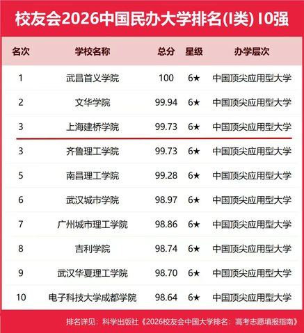 校友会中国大学排名首发于2003年,评价体系涵盖办学层次、思政教育、教学质量、学科专业、科研成果、社会服务等12个一级指标,评估指标达900多项,是具有广泛社会公信力的大学排名品牌。2026年排名首次对民办高校采用“研究型”与“应用型”分类评价,其中应用型高校又按优势学科门类细分为Ⅰ类(工学为主)、Ⅱ类、Ⅲ类,旨在引导高校科学定位、特色发展。在竞争激烈的Ⅰ类排名中,武昌首义学院位列榜首,文华学院排名第二,上海建桥学院则凭借扎实的办学成效稳居第三。