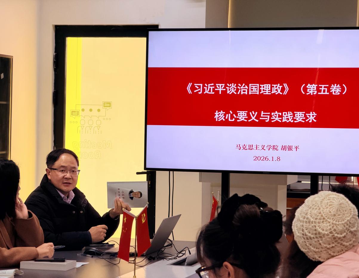 2026年1月9日下午,为进一步深化党的创新理论武装,提升党员教师政治素养,艺术设计学院特邀马克思主义学院副院长胡银平开展《习近平谈治国理政》第五卷专题辅导讲座。会议由教工党支部书记张慧慧主持,学院党委书记王丽佳、教工党支部副书记位霞丽及全体职工党员参加了此次学习。