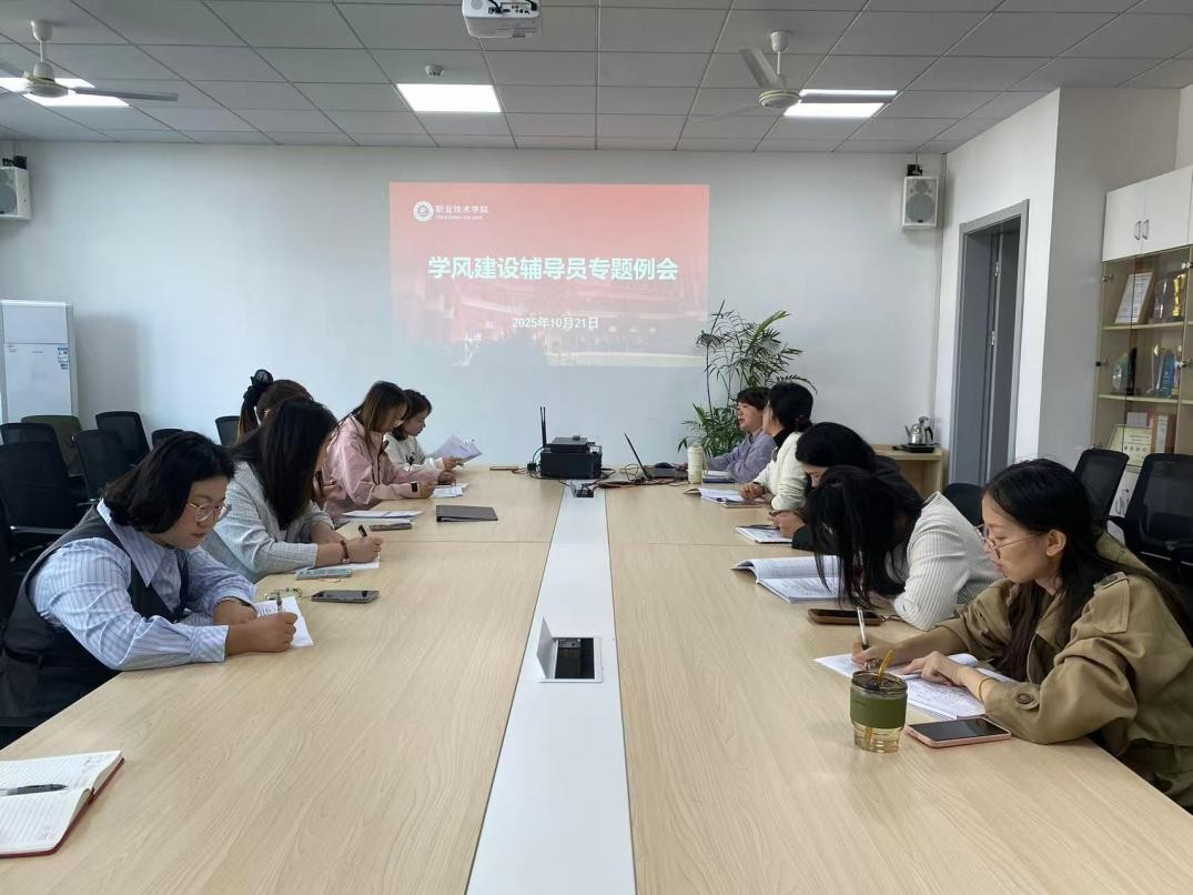 10月21日,职业技术学院学风建设专题会议在学院会议室419召开,学院副书记马冯莉老师主持会议,全体辅导员参加。