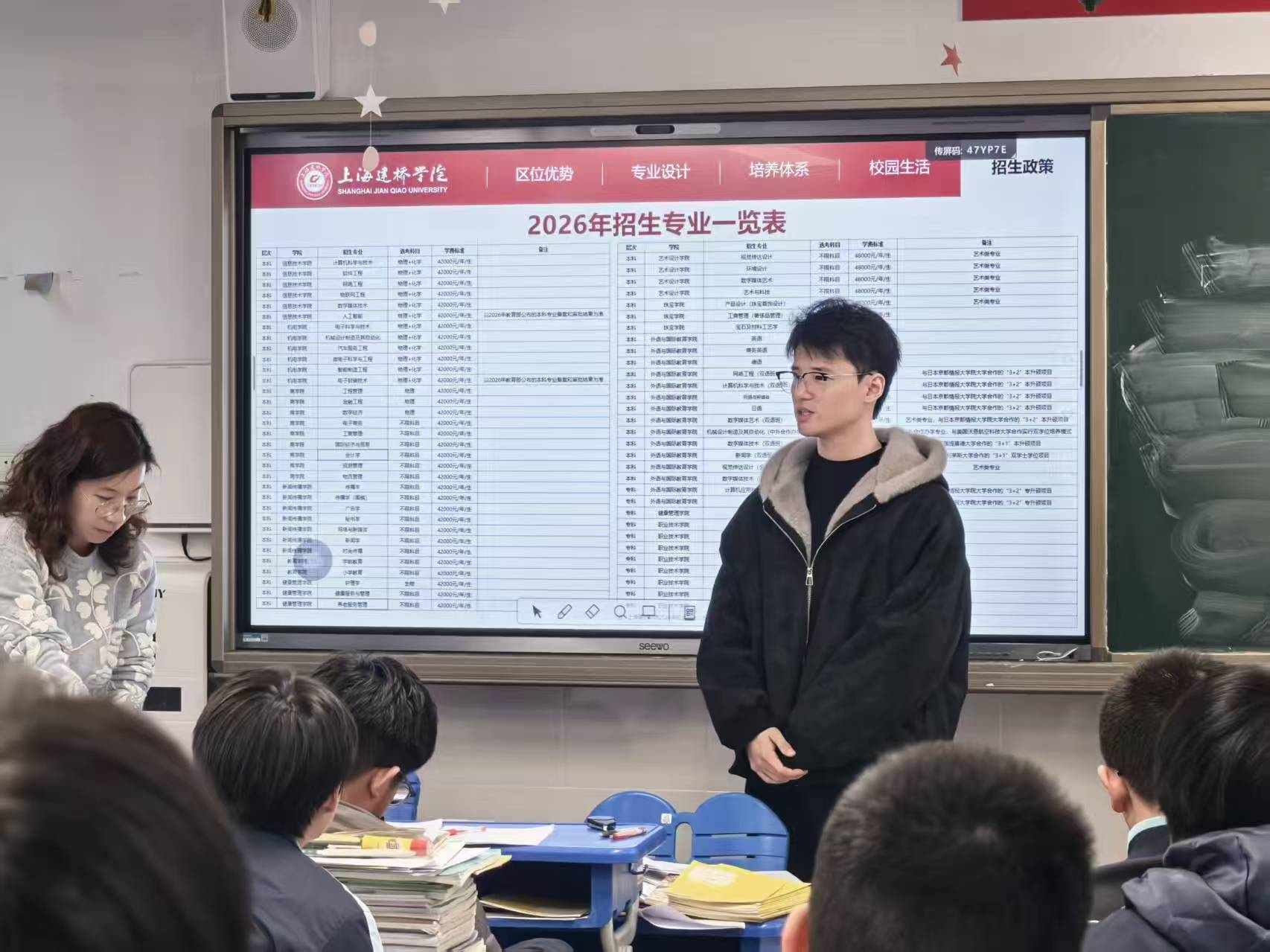 宣讲筹备阶段,宋鑫主动与高中对接人许意达老师取得联系,得知许老师对此次活动高度重视,第一时间协调了高三年级各班班主任,提前通知学子们梳理自身困惑、做好提问准备。随后,宋鑫与黄鑫怡、顾毅诚、徐泽旸三位同学反复沟通,结合高境第一中学的办学特色、学子升学需求,以及四人不同的专业背景,精心梳理宣讲框架,逐一打磨五大核心讲解内容,补充了大量贴合上海学子、贴合各专业的实用细节——既有会计专业的实训场景,也有数艺专业的创作案例,更有养老服务、商日专业的特色优势,只为让宣讲更接地气、更具针对性。重返校园的那一刻,四人快速卸下紧张,带着最饱满的状态,走进教室,开启了这场专属的青春分享。