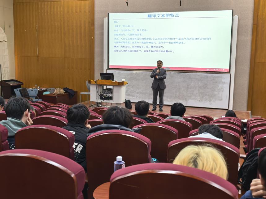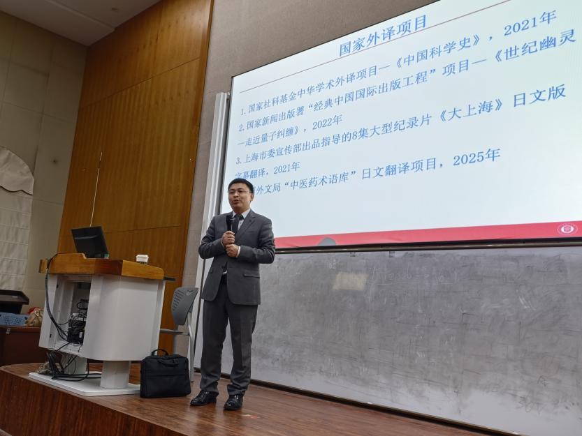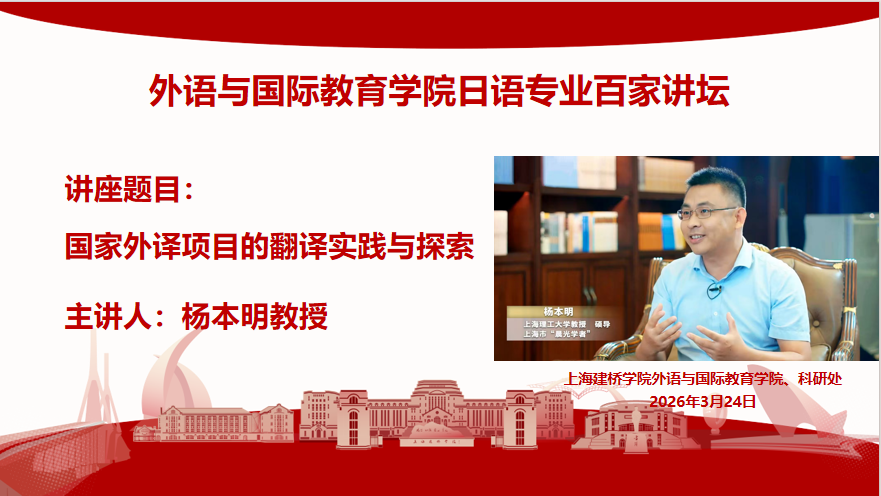 2026324日,上海理工大学外语学院日语系主任、博士生导师杨本明教授应邀莅临上海建桥学院,走进《百家讲坛》大课堂,以“国家外译项目的翻译实践与探索”为题,在三教222报告厅为师生带来了一场兼具学术深度与家国情怀的精彩讲座。本次讲座由外语与国际教育学院、科研处联合主办,日语系赵萍主任主持。来自外教院各专业的师生汇聚一堂,共同聆听这位年轻学者——日语教育、翻译研究与实践领域的深耕者,如何以译笔为桥,向世界讲述中国故事。
