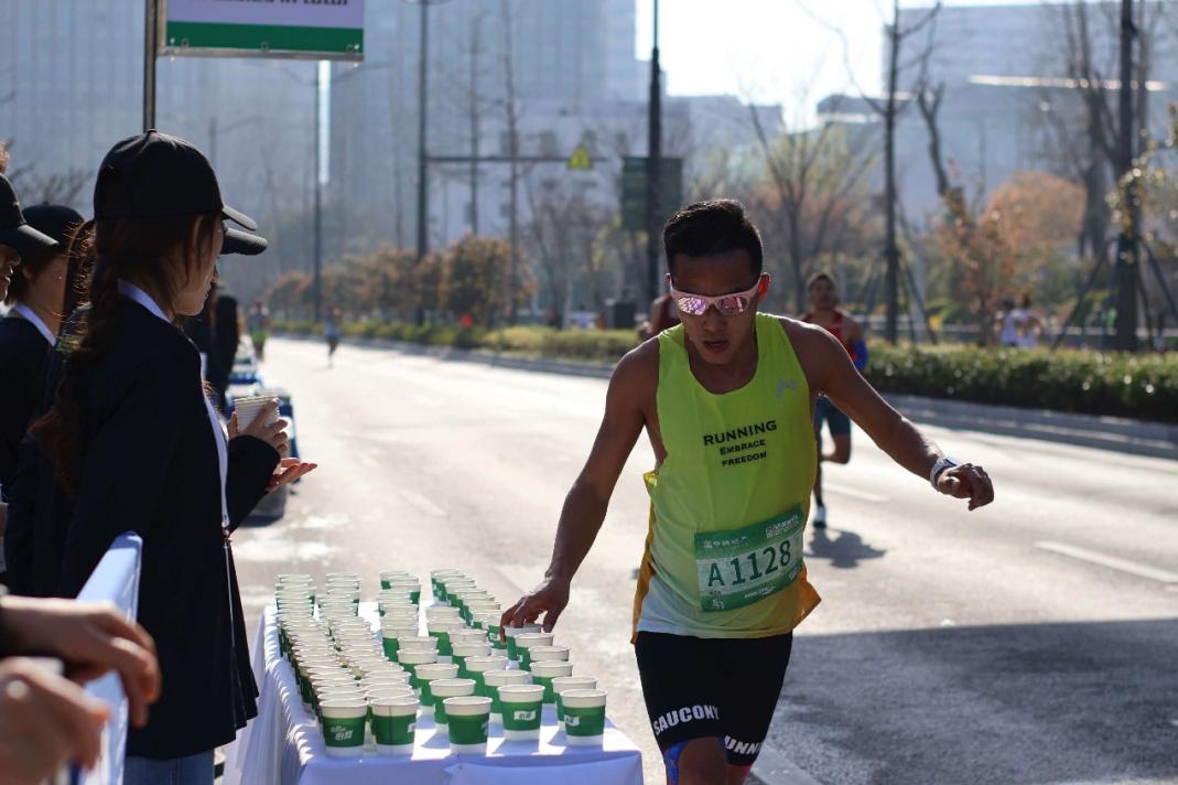 •高效补给:在补给站点,志愿者们将饮用水、能量水迅速倒入杯中,整齐排列在桌台,方便跑者快速取用。