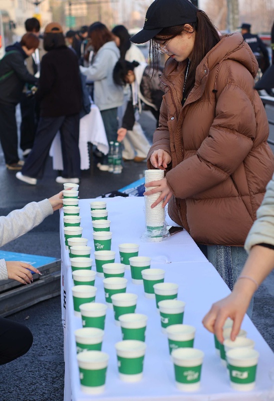 图:志愿者们在补给站为杯中注水,用行动传递温暖