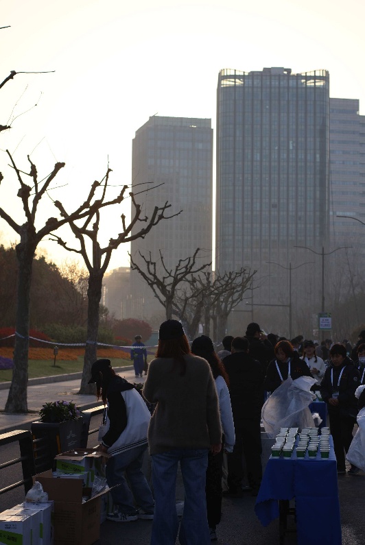 春日晴好的城市赛道上,身着各色运动装备的跑者汇成一道流动的风景,而身着黑色志愿服装的志愿者安静守候在补给台后。每当水杯被取走,志愿者便立刻上前续满、归位,确保补给台上始终杯满水足、不留空缺,让跑者们在自己的节奏里,随时都能触碰到一份清凉。志愿者以默默坚守,保证每一杯水及时到位,为每一份坚持与热爱保驾护航。