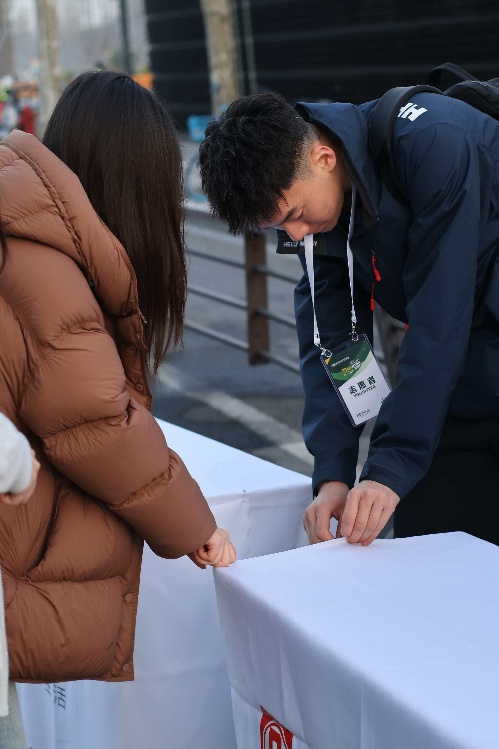 •站点搭建:细致铺设桌布、固定标识牌,将补给器具整齐归置,为跑者打造便捷高效的补给环境。