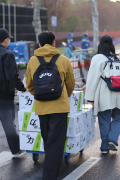 图:志愿者合力搬运补给物资,保障赛事供应充足
